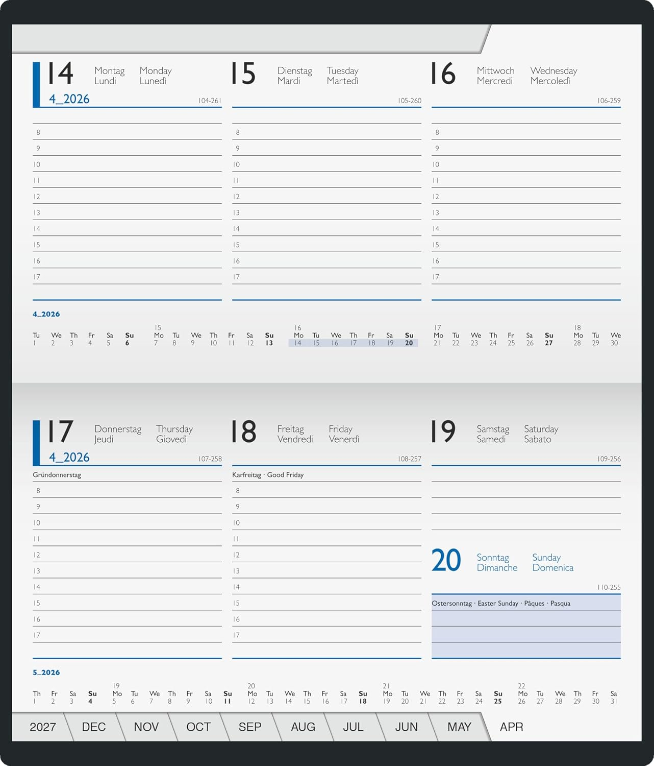 Navigare Simplă: 📑 Echipată cu clapă de căutare (Search Flap) și registru lunar tăiat cu tab-uri întărite pentru a găsi instantaneu luna dorită.1