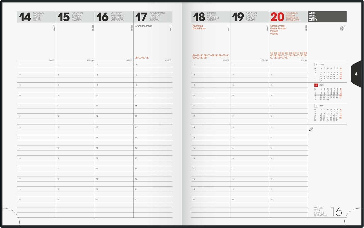 Limbaj: Agenda este cvadrilingvă: Germană, Engleză, Franceză, Italiană.