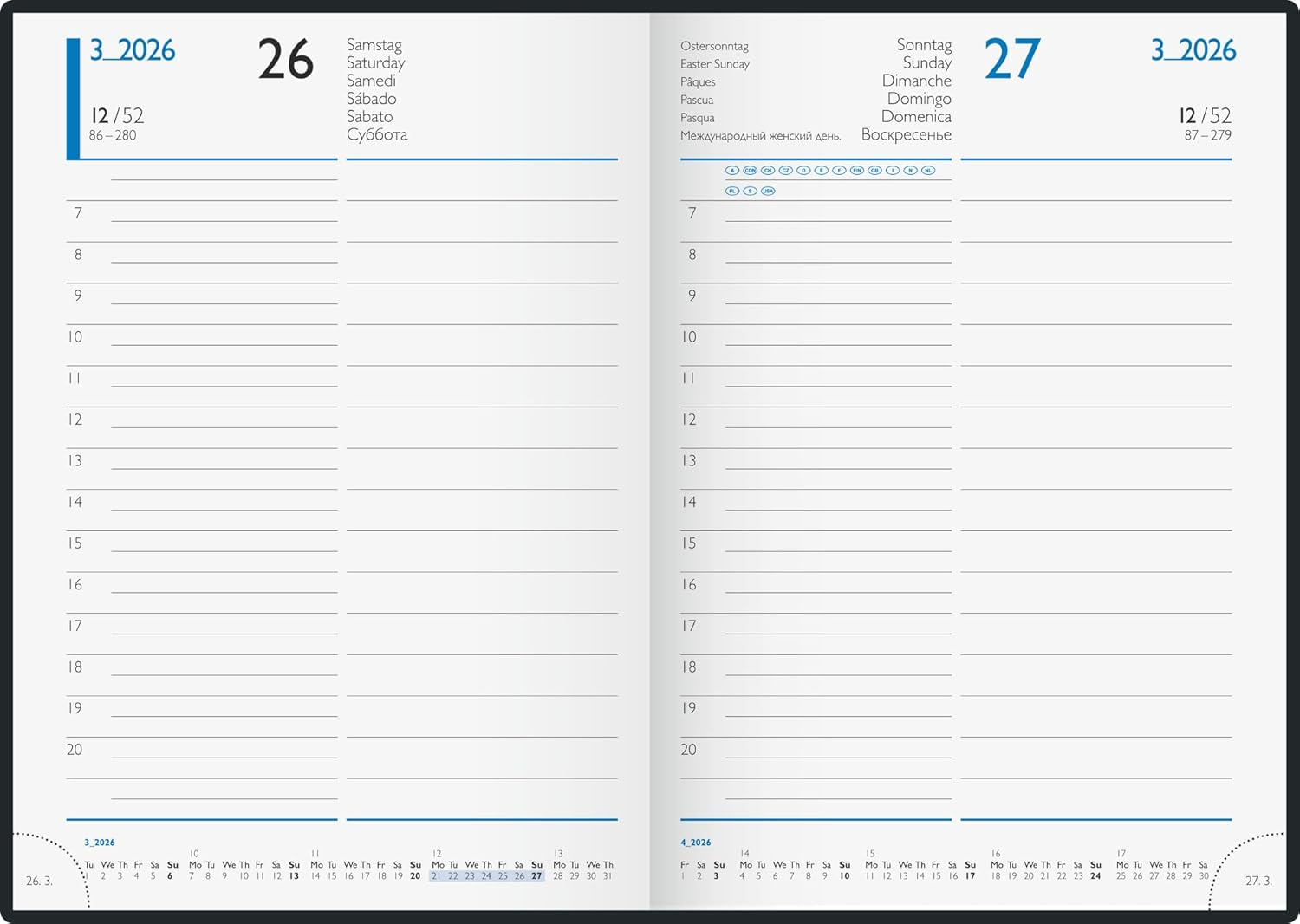 Limbaj Extins: Agenda este sexalingvă (6 limbi): Germană, Engleză, Franceză, Spaniolă, Italiană, Rusă.
