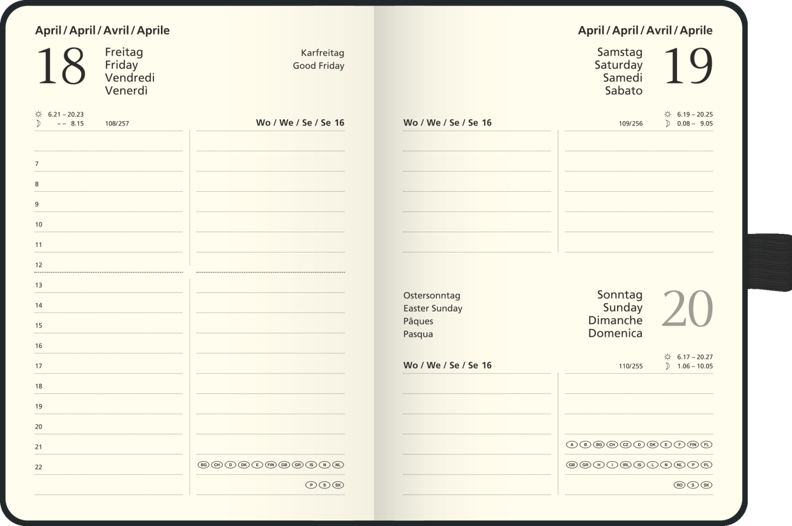 • Limbaj: Agenda este cvadrilingvă: Germană, Engleză, Franceză, Italiană.