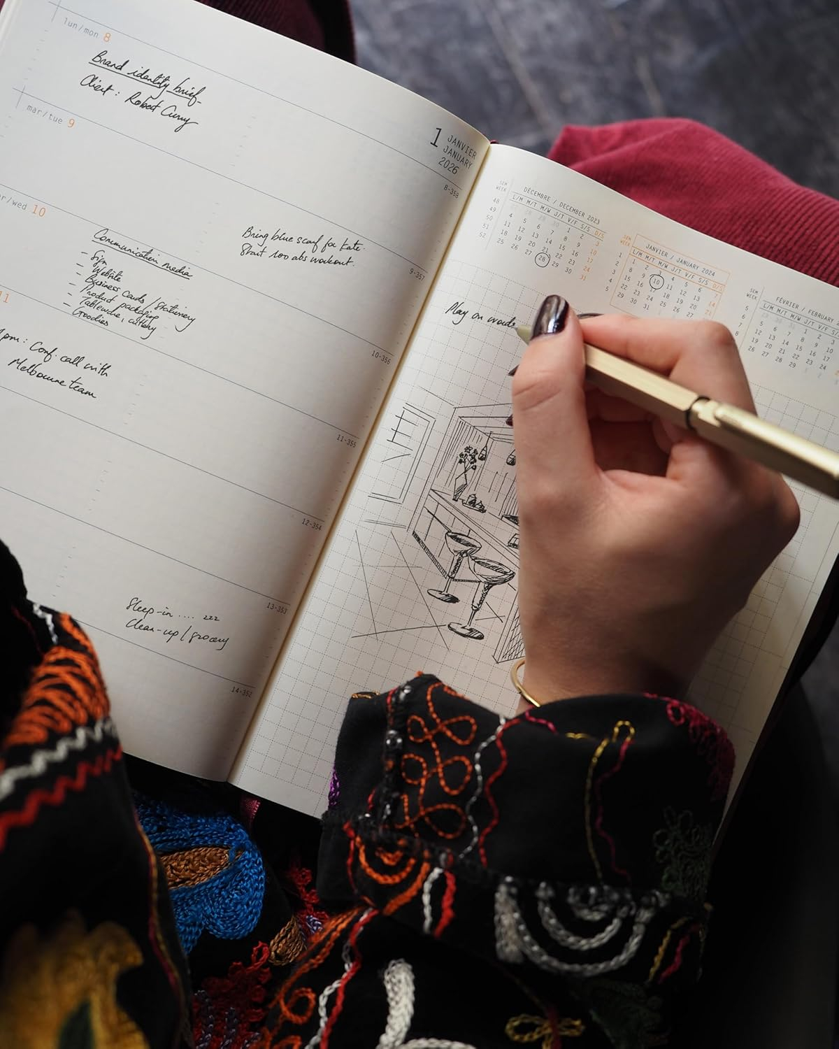 Agenda are un format practic A5 (14.8 x 21 cm) și un design elegant, cu o copertă fixă din piele ecologică italiană de culoare Violet Vinete (Aubergine Violett). Interiorul folosește un calendar săptamânal orizontal pentru o organizare optimă.