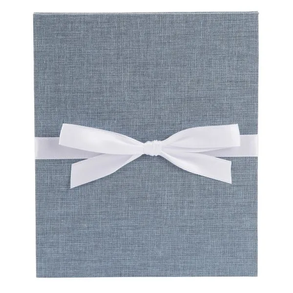 📷 Un album foto de înaltă calitate, cu copertă din material textil gri și o fundă decorativă, ideal pentru păstrarea momentelor speciale sau ca un cadou elegant