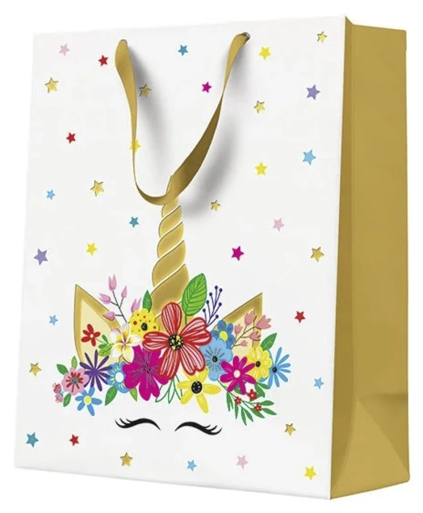 Transformă orice aniversare într-o celebrare de basm cu sacoșa de cadou „Unicorn Party” în format mare. Ideală pentru daruri voluminoase, această sacoșă îmbină o ilustrație adorabilă cu accente aurii strălucitoare, fiind special creată pentru a aduce bucurie copiilor și fanilor universului fantastic. Designul central înfățișează un unicorn stilizat cu o coroană florală bogată în nuanțe de roșu, galben și albastru, totul sub o ploaie de stele multicolore. Cu un format orizontal generos, este soluția perfectă pentru jucării mari, jocuri de societate sau seturi creative, oferind o prezentare impecabilă fără efort.