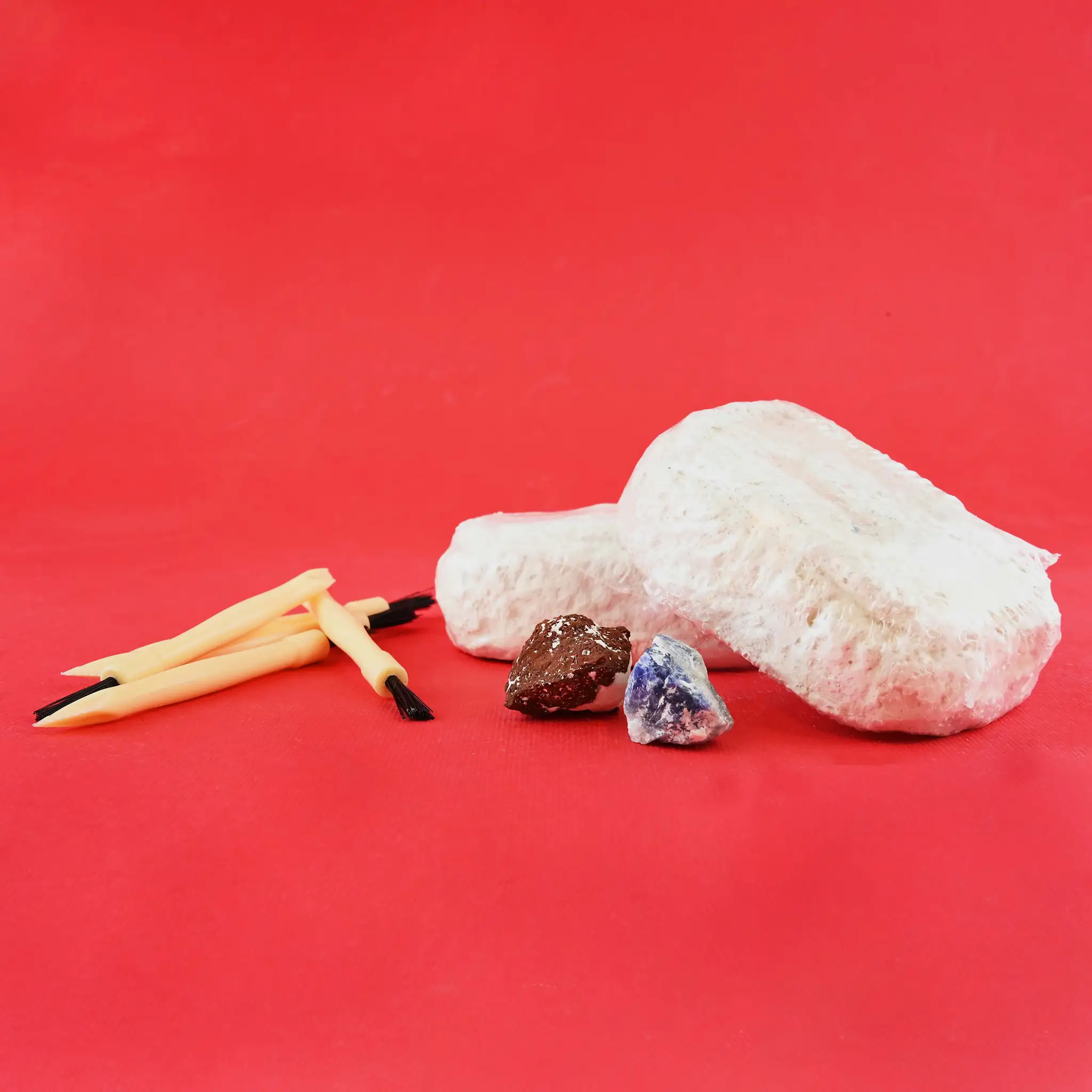 Setul include un bloc de excavare sub formă de piatră naturală care ascunde în interior surprize geologice fascinante.