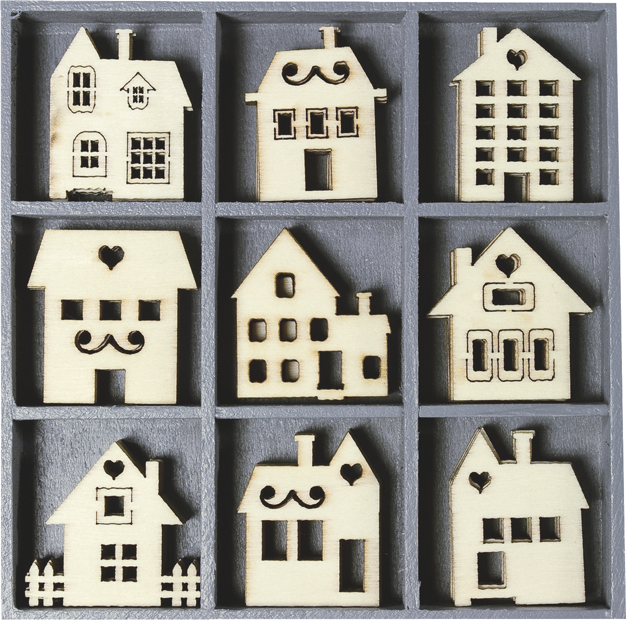 for decorations, card design, etc. motif size motif approx. 3 cm, box: 10.5 x 10.5 cm 45 pieces Houses plywood in film