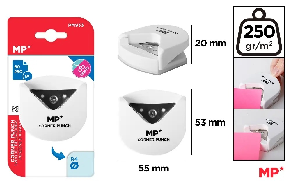 Etichete: dimensiune compactă, Perforator colțuri, Raza 4 mm, Ștampilă rotunjită, Hârtie și folie