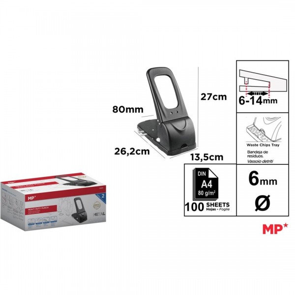 Etichete: perforator profesional, IPB 100 coli, Metalic negru, PA651, Capacitate 100 coli, Reglabil 6-14 mm, Distanță între perforatoare 80 mm, Levă ergonomică, Șină de oprire, Durabil și fiabilPerforator profesional, Durabil și fiabil