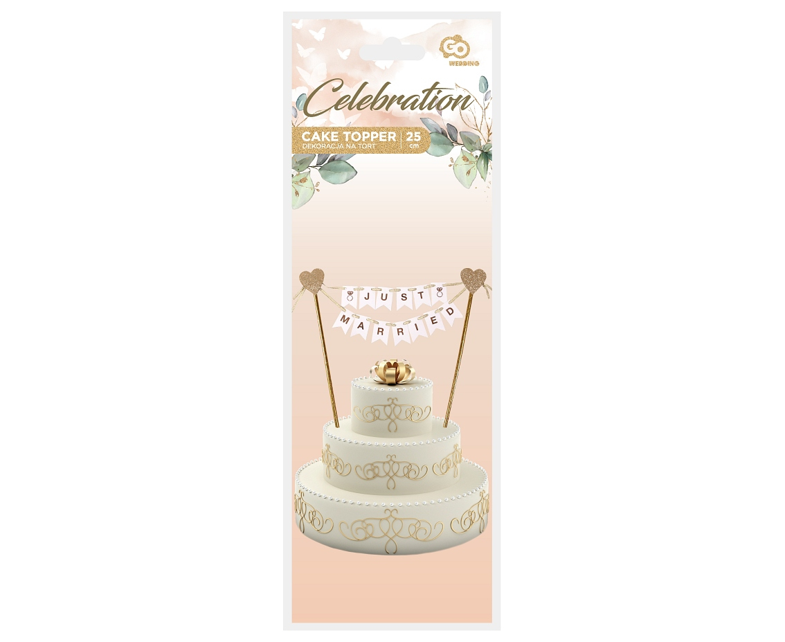 Decor pentru tort de nuntă „Just Married” de la Godan S.A., în culoare auriu, cu înălțimea de 25 cm și un model cu inscripția „Just Married”, perfect pentru a impresiona invitații și a adăuga eleganță evenimentului.