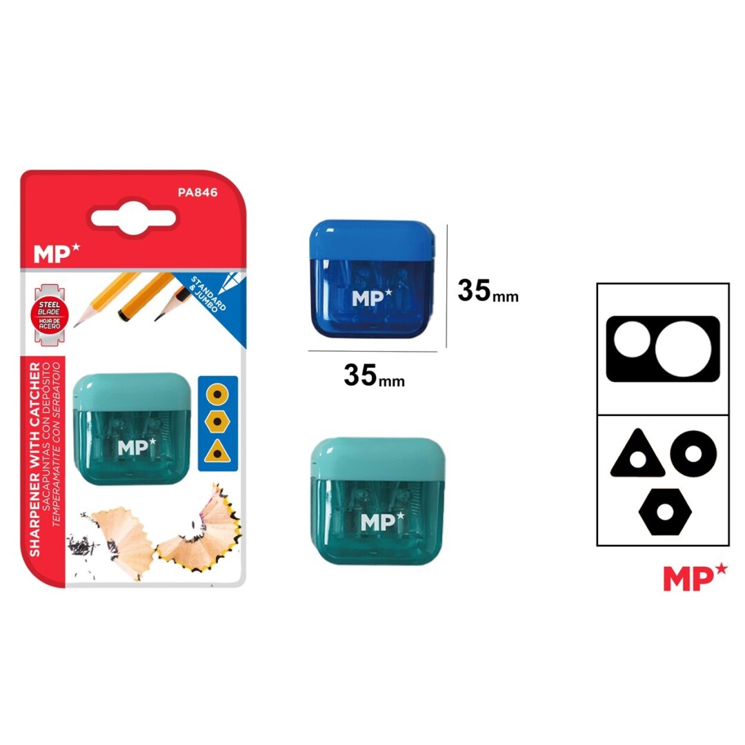 Ambalat într-un blister cu o unitate, ASCUȚITOARE DUBLĂ CU CONTAINER IPB PLASTIC TRANSLUCID PA846 are dimensiunile de 35 x 35 mm, fiind compact și ușor de transportat în ghiozdan sau birou.