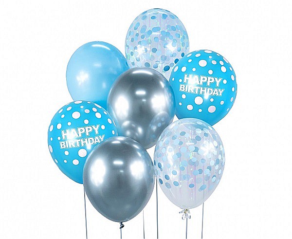 set de 7 baloane, culori asortate, 30 cm, argintiu si albatru cu "happy birthday"