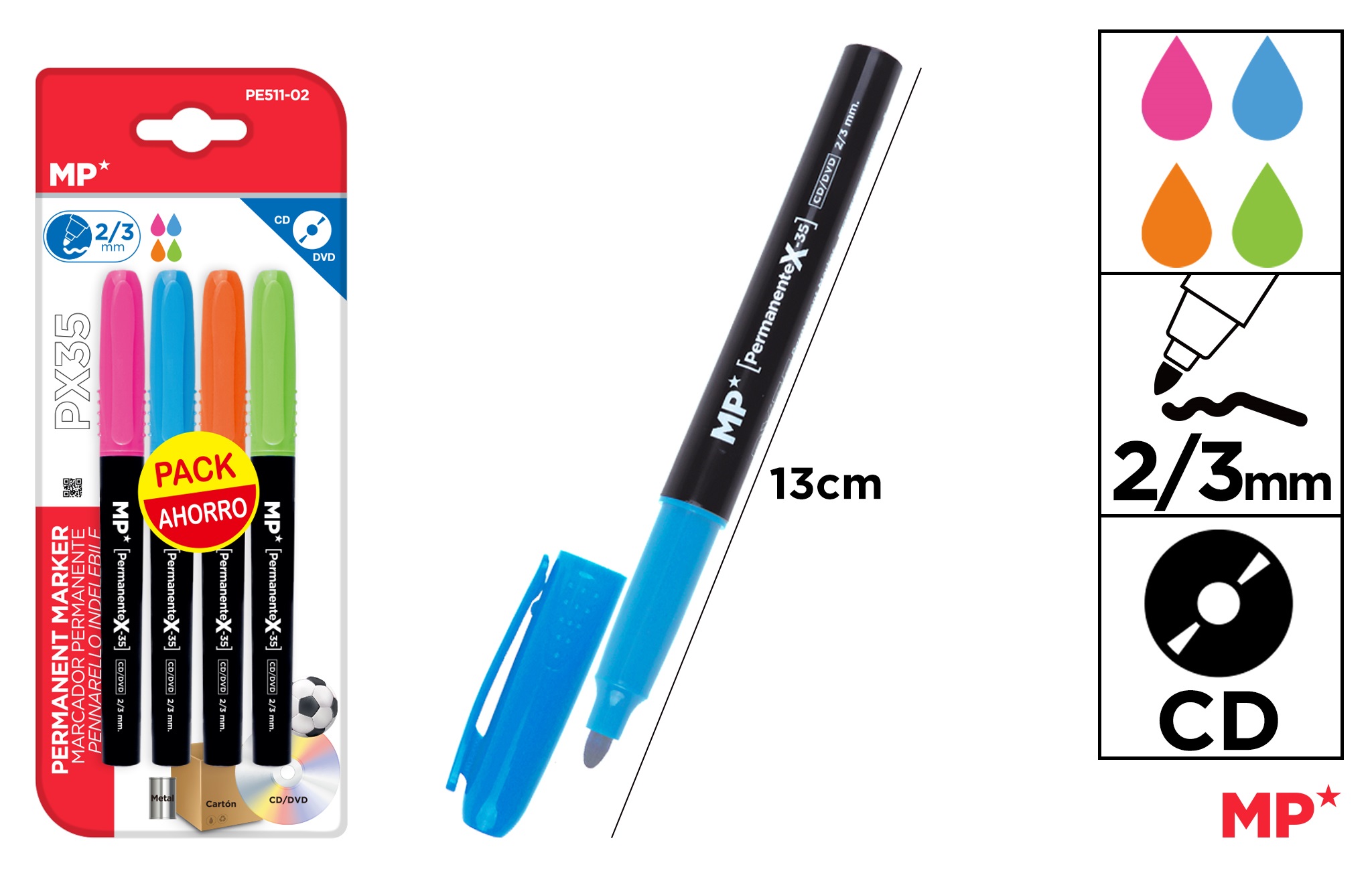 Corpul si capacul sunt de culoarea cernelei care e pe baza de alcool. Sunt ideale pentru notari vizibile pe majoritatea suprafetelor.
