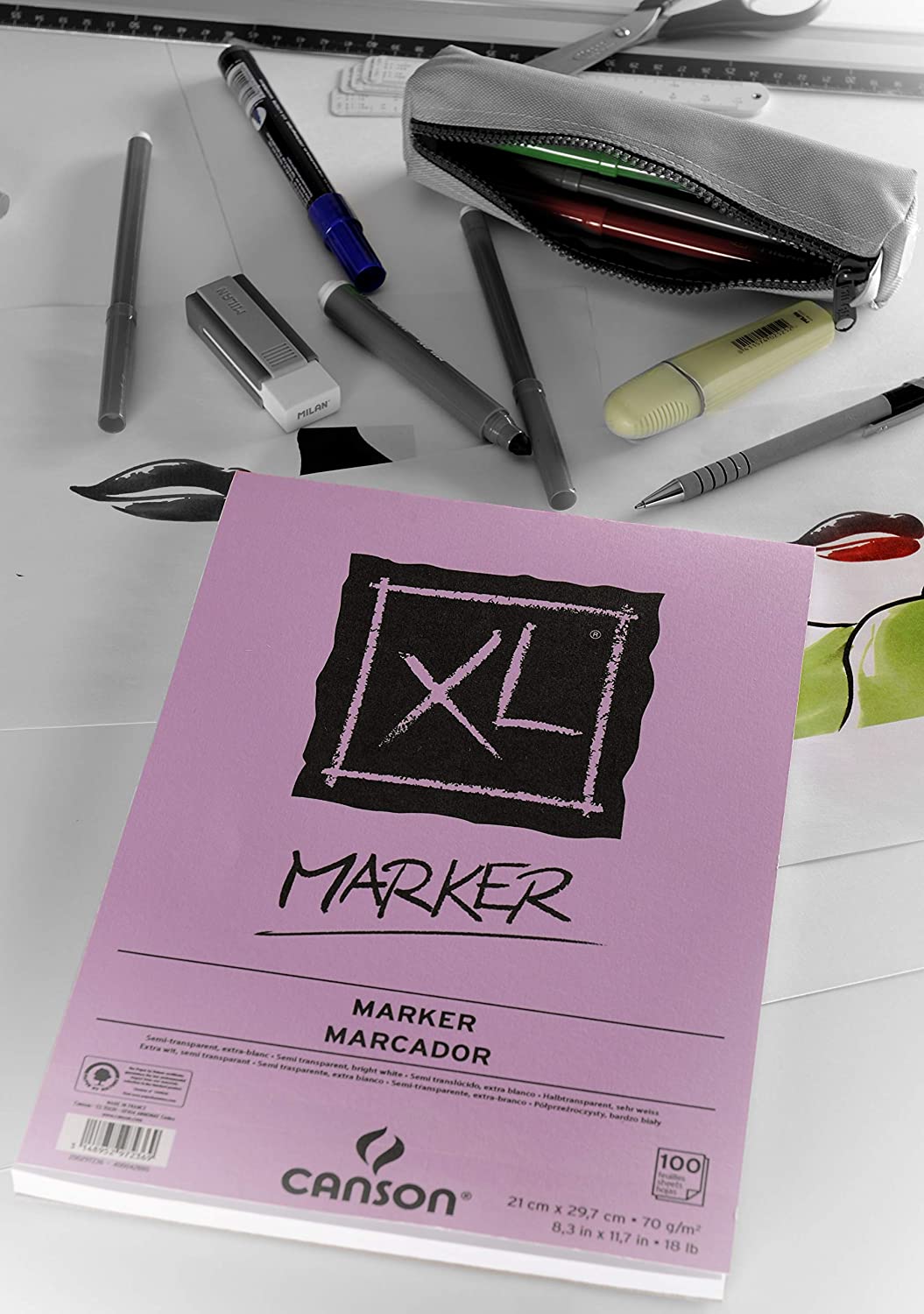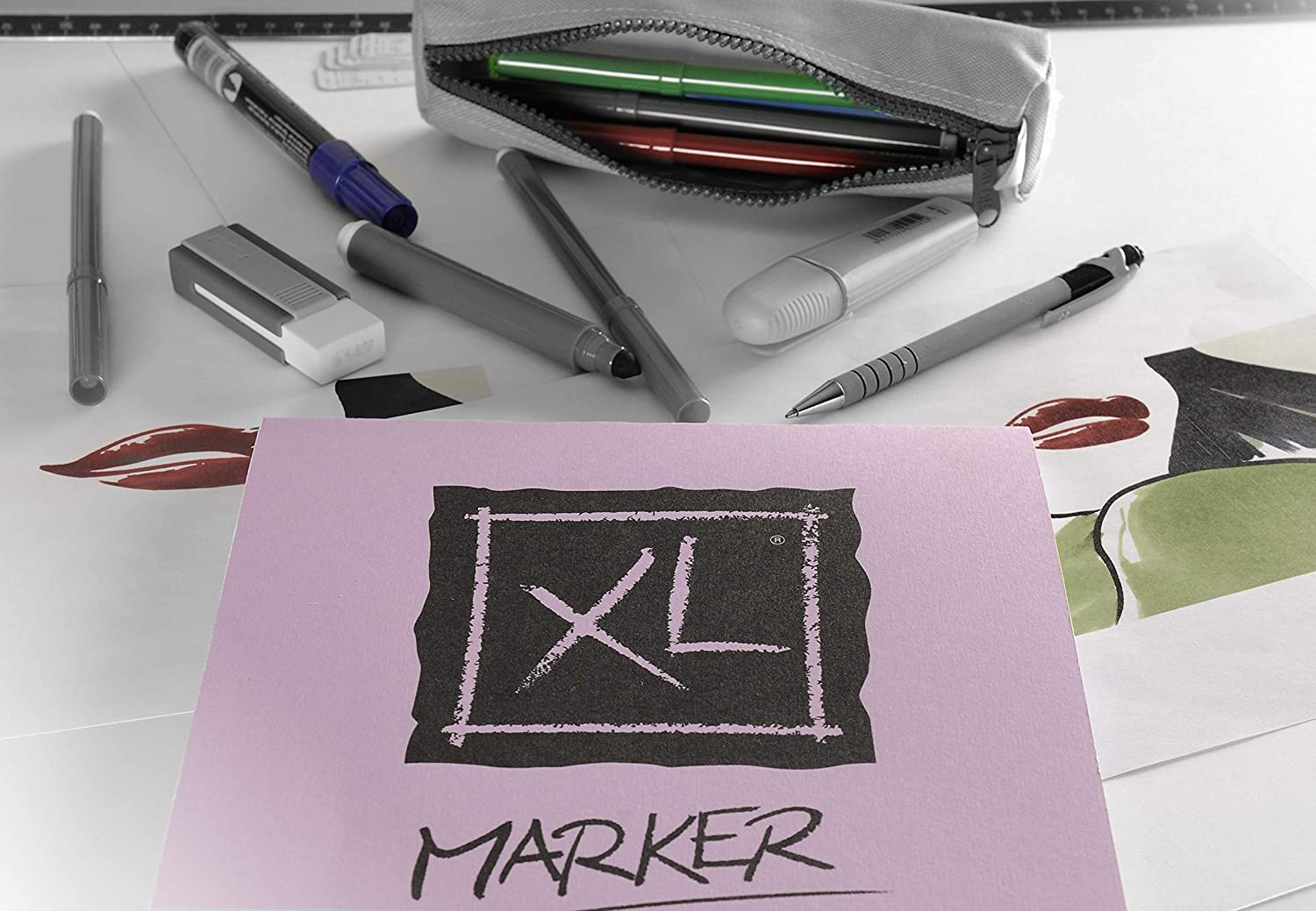 Hartia din blocul XL Marker este semi-transparenta, foarte alba si foarte neteda, permitand lucrul cu mai multe straturi de culoare.