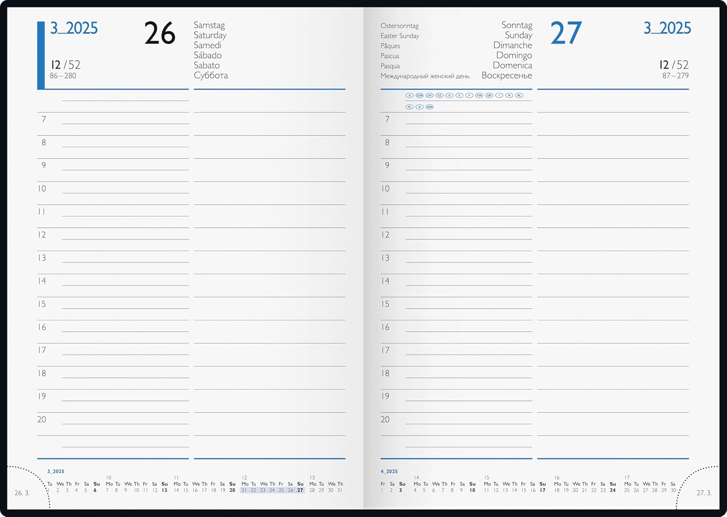 • 1 pagină = 1 zi, cu 1 pagină de previzualizare a lunii înainte de fiecare lună