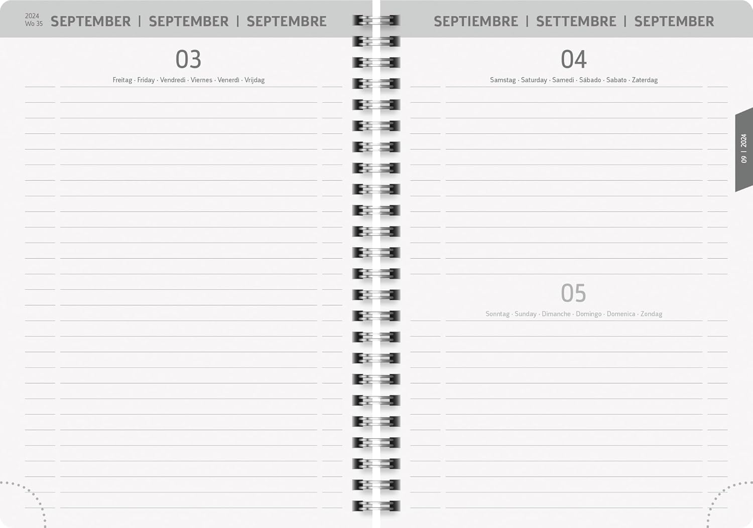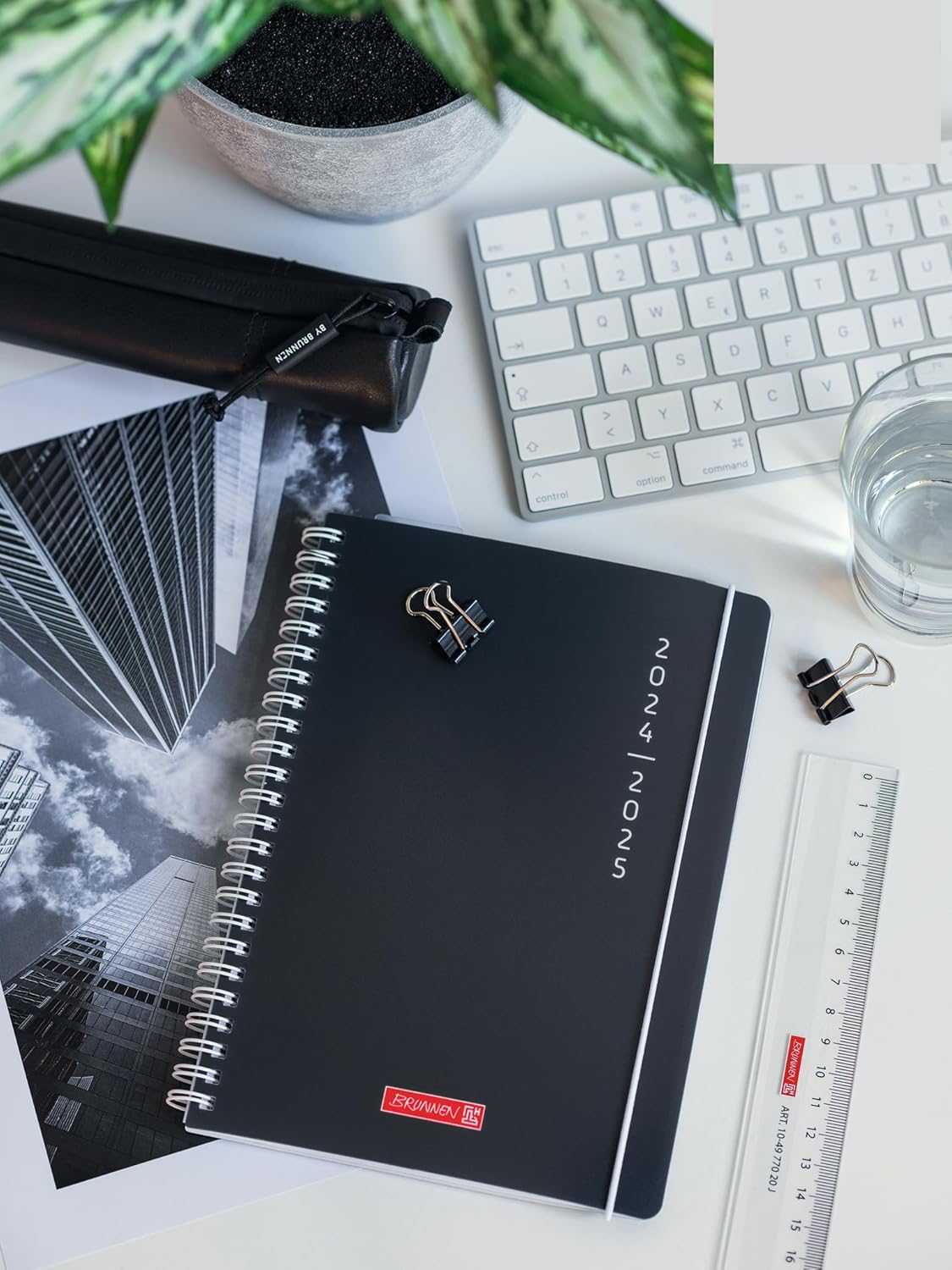 Etichete: A5, plan lunar, agende datate, agende datate 2025, 352 pagini, Agenda școlară Spira, Anul școlar 2024-2025, Wire-O (legătură spiralată), Informații despre vacanțe, Închidere cu elastic, Riglă inclusă, datată zilnic, Culoare Plain Black