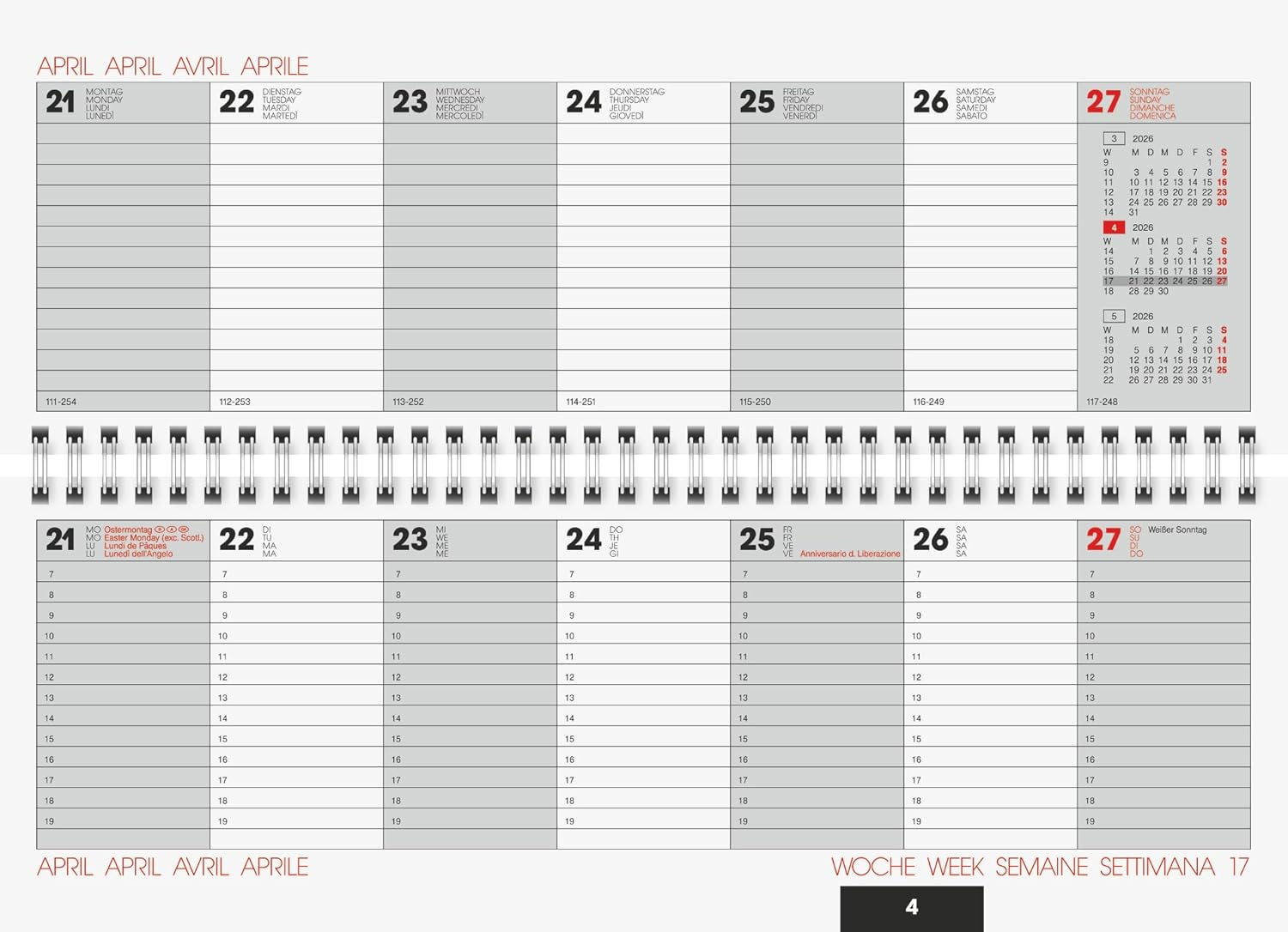 Limbaj: Agenda este cvadrilingvă: Germană, Engleză, Franceză, Italiană.