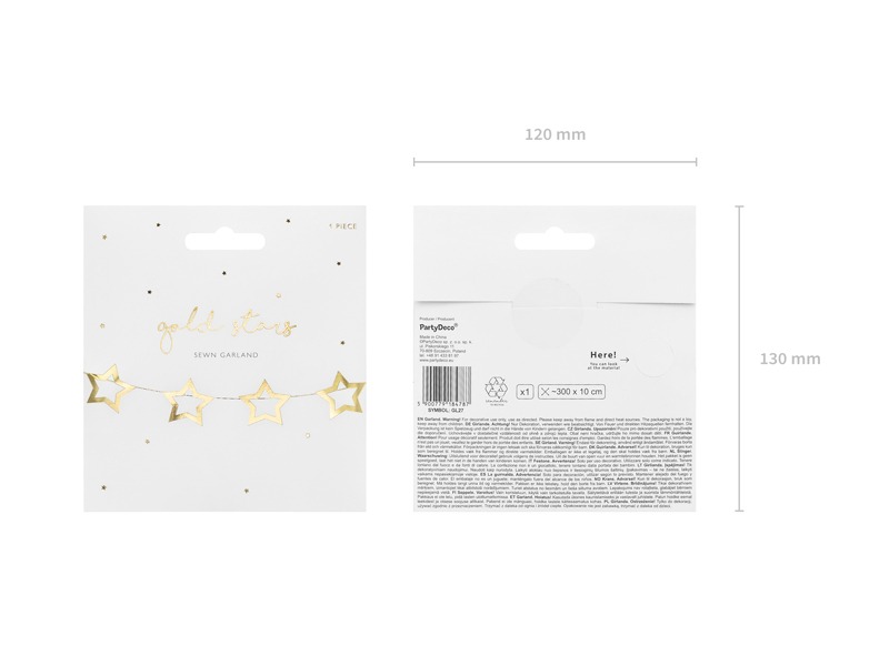 Ghirlanda cusută cu stele din hârtie de culoare auriu metalic, lungime aproximativă 3 m, înălțime aproximativă 10 cm.