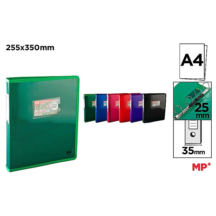 Caiet mecanic cu inele, din polipropilenă lucioasă. 4 inele de 25 mm. Cotor de 35 mm. Margini tăiate în material textil în culoarea dosarului pentru o mai mare protecție. Include un presor din plastic pentru a ține mai bine documentele și un suport de card pe coperta pentru personalizare. Pentru documente A4. Dimensiuni: 350x255 mm. 6 culori asortate: roșu, violet, violet, albastru închis, verde și negru.