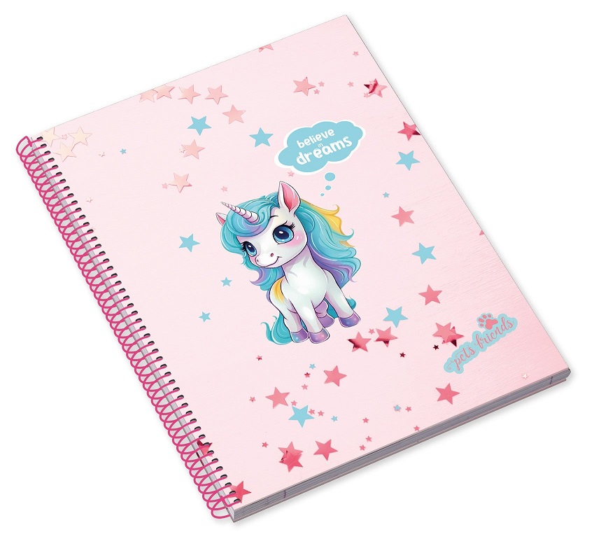Acest caiet din colecția Ambar Pet Friends este o celebrare a prietenilor imaginari, care sunt atât de importanți în copilărie. Inspirat de creaturi magice precum unicornii, colecția aduce un strop de fantezie și securitate în viața de zi cu zi a copiilor.