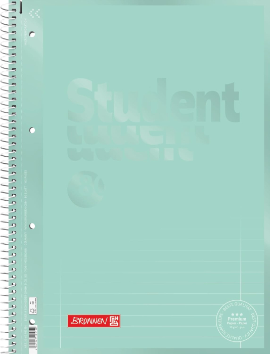 Caietul A4 Brunnen Color Code Verde Mentă (cod 69927154) este un caiet cu spiră metalică fabricat de Baier & Schneider GmbH Germania, cu format A4 de 29,8 x 22,4 cm, 80 de file de 160 pagini cu gramaj de 90 g/mp hârtie satinitată alb intens, liniatură Lin. 27 dictando cu margine dublă interior și exterior, copertă verde mentă cu efect mat-lucios tactil, microperforații cu ajutor detașare, 4 perforații standard pentru arhivare și certificare FSC MIX, disponibil pe ipb.ro. În gama completă Brunnen disponibilă pe ipb.ro, modelul Color Code Verde Mentă se aliniază cu modelele Tulip la nivelul premium al gamei, partajând hârtia de 90 g/mp, liniatura Lin. 27 cu margine dublă, finisajul mat-lucios tactil al coperții și certificarea FSC MIX, diferind exclusiv prin culoarea coperții, verde mentă față de roșu lalea al Tulip. Față de modelele Pastel II și Brunnen Roșu cu gramaj standard, Color Code Verde Mentă reprezintă o treaptă superioară de calitate a hârtiei și finisajului coperții.