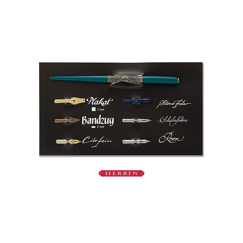 Set contains; 1 x Holder made of wood with 6 Feathers (Sténo/Pan Cito fine band pull/3 nib – 1/2/3 mm) and a removable protector for beginners.