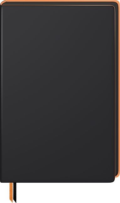 🖊️ Copertă moale, flexibilă din PU, în culoare neagră și portocaliu neon, cu colțuri rotunjite pentru durabilitate și confort în utilizare