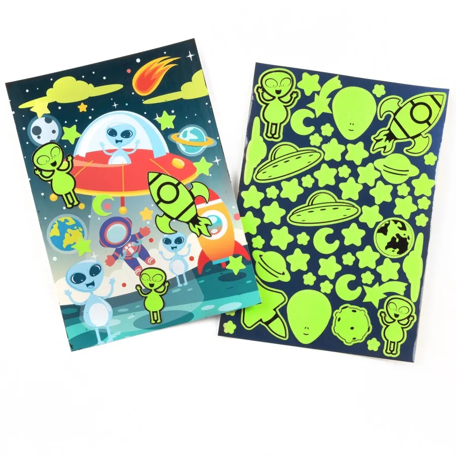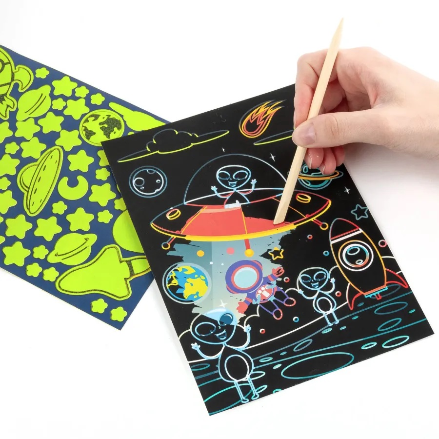 Ușor de folosit, tot ce trebuie să faceți este să utilizați un stilou din lemn pentru a zgâria stratul negru și a descoperi monștri spațiali plini de culoare. După ce ați terminat, puteți răsuci pagina și începe să colorați cu ajutorul stickerelor magice care strălucesc în întuneric, incluse în set. Iată ce face acest produs atât de special: