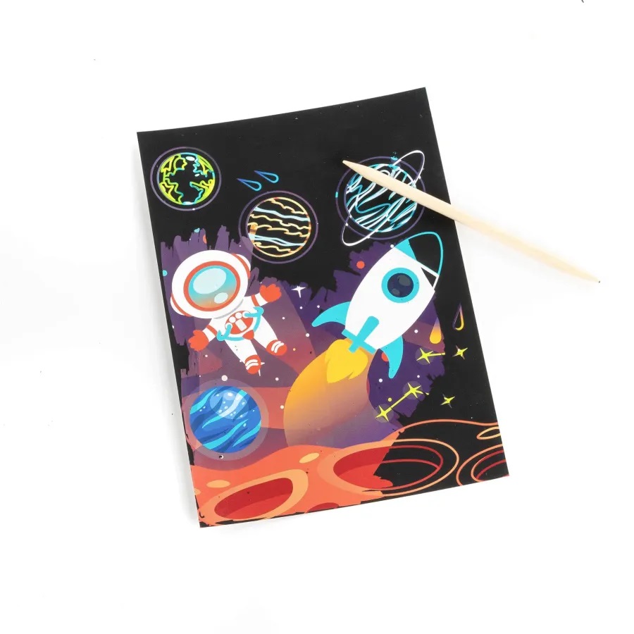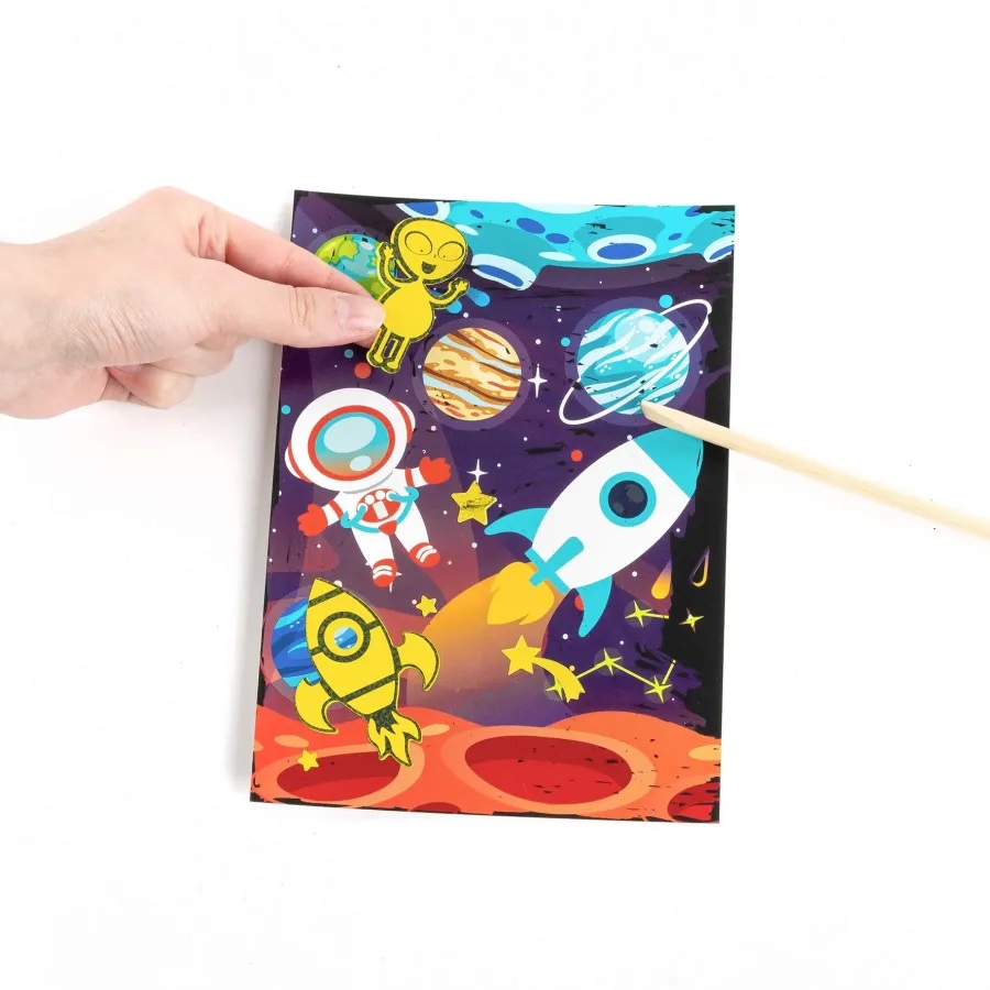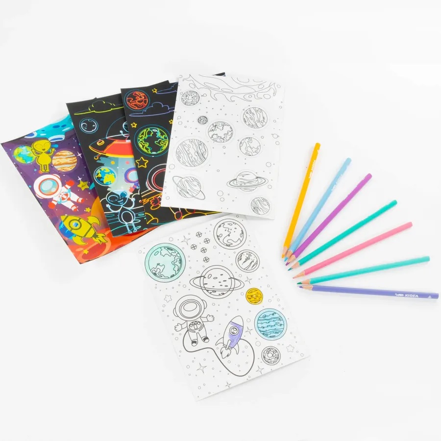 Carte de Colorat Scratch Art Book 5 Coli + Stickere Cosmos Glow in the Dark Kidea SCWKKKA este soluția perfectă pentru a menține copiii ocupați și creativi! Această carte inovatoare combină magia zgârierii cu coloratul, aducând distracție fără limită.