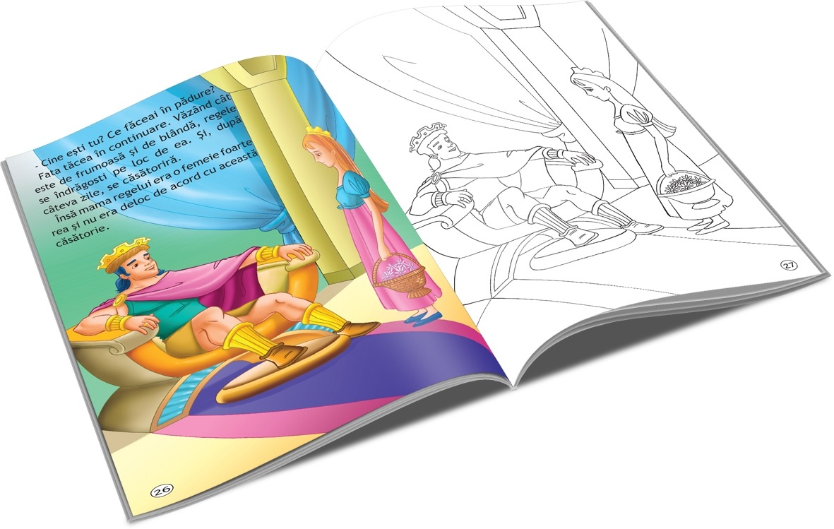 CARTE COLORAT ȘI POVESTE A4: POVESTEA CELOR ȘASE LEBEDE este o combinație fermecătoare de poveste și activitate artistică, ideală pentru copii!