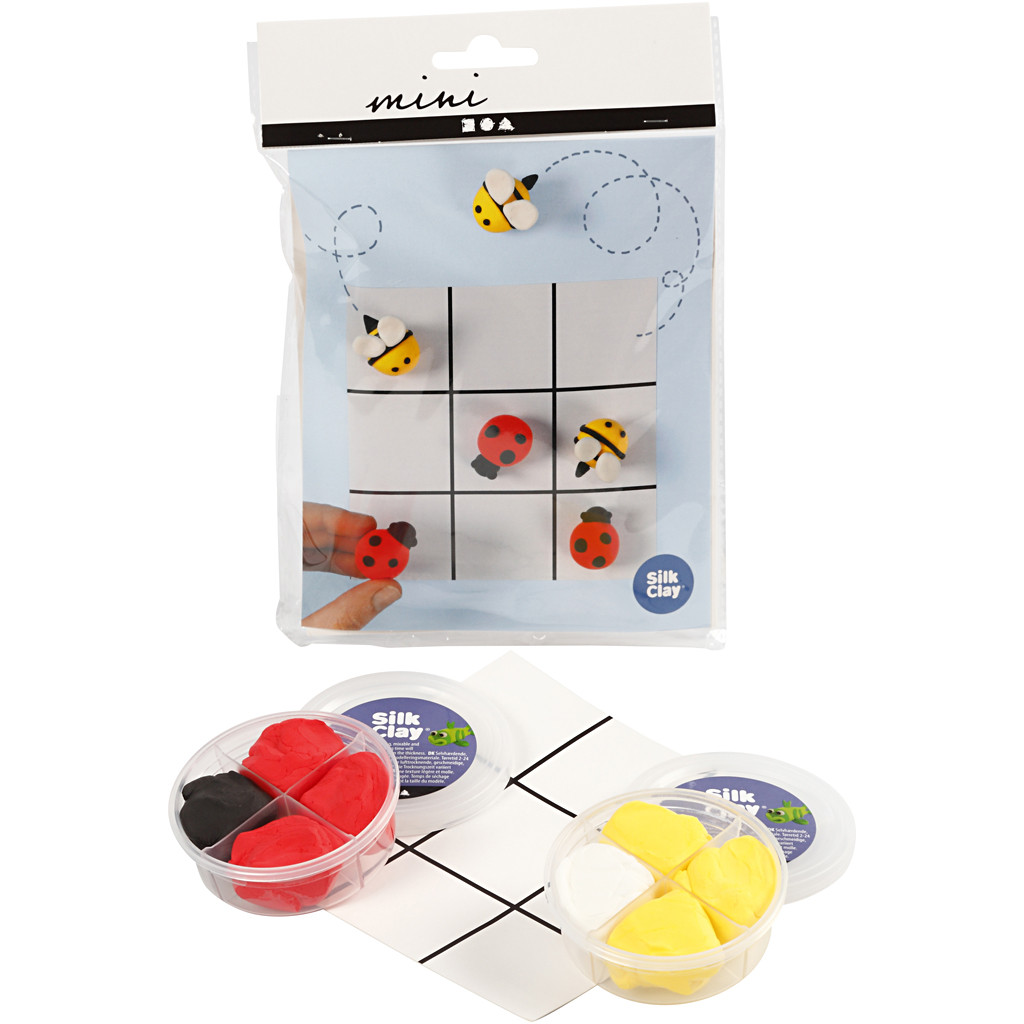 Material kit for tic tac toe game with pieces of Silk Clay and pre-printed playing board in heavy cardboard. Content: Silk Clay in 4 colours and card .