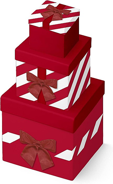 Cutie Cadou 3/Set Crăciun X-31103-BXC Clairefontaine - Un set de 3 cutii pătrate, Dimensiuni: Cutie 1: 9.5 x 7.5 x 9.5 cm, Cutie 2: 11.5 x 10 x 11.5 cm, Cutie 3: 15.5 x 12 x 15.5 cm. Setul include cutii cu design roșu/alb, accesorizate cu fundițe, ideale pentru cadourile tale. Veți primi 1 set, constând în 3 cutii pătrate.