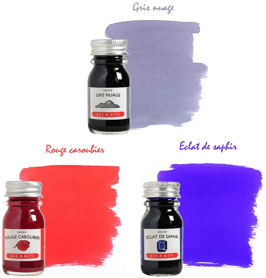 3 sticle asortate de cerneală Herbin: strălucire safir, gri nor și roșu roșcov. Cerneală special formulată pentru utilizare cu un suport pentru stilou. Este