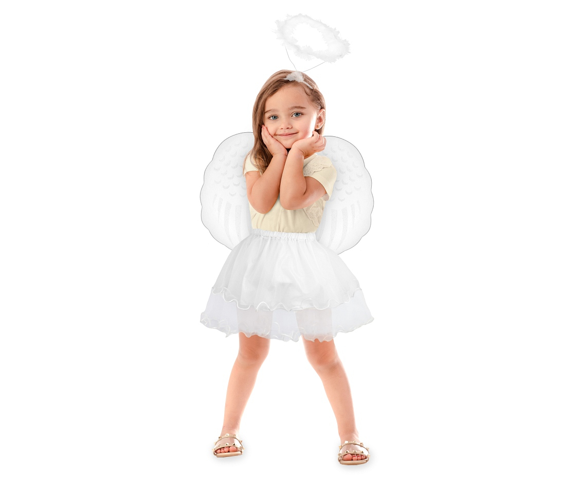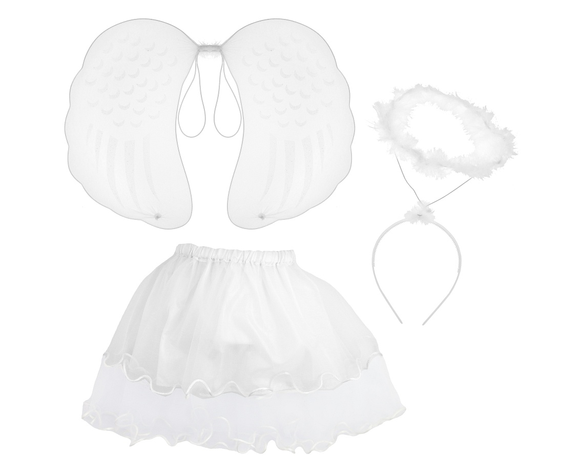 Costum Ingeras: Fusta, aripi si aura, pentru copii, fusta este din tul cu dublura de satin alb, material 100% poliester.