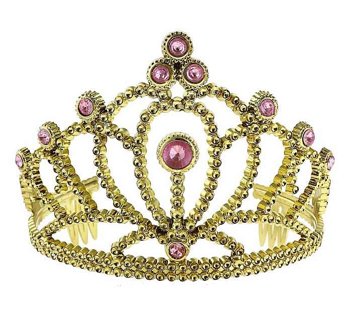 Didadema din plastic de culoare aurie. Decorata cu zirconiu cubic din plastic roz. Se pune pe cap cu piepteni fixati in par.