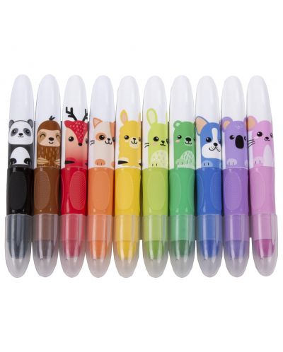 Creioane cu gel în 10 nuanțe unice. Desenul cu ei este o plăcere pură, mișcările devin atât de fine și efectul este neted. Un avantaj suplimentar îl reprezintă animalele minunate, un model diferit pe fiecare creion. Sunt foarte eficiente, moi și au o acoperire excelentă. Sunt perfecte pentru colorarea suprafețelor mari. Nu necesită ascuțire - inserția lor este scoasă cu un buton. Perfect pentru copiii care abia își încep aventura cu arta. Atenţie! Colorarea cu ele creează cu adevărat dependență