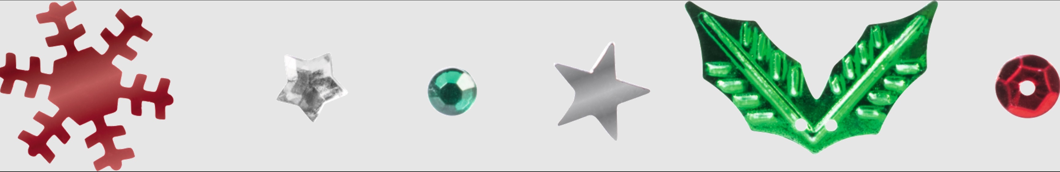 • Materiale: Fulgi de zăpadă, strass-uri, stele, vâsc, paiete