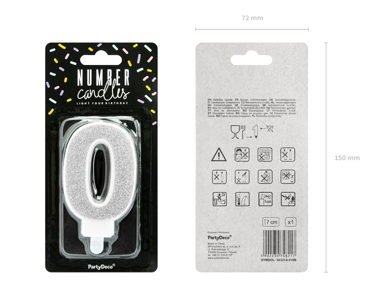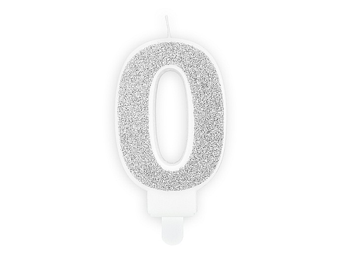 Birthday candle Number 0, silver glittery, size approx. 7 cm.