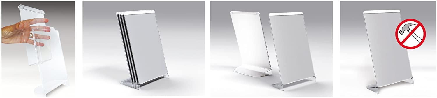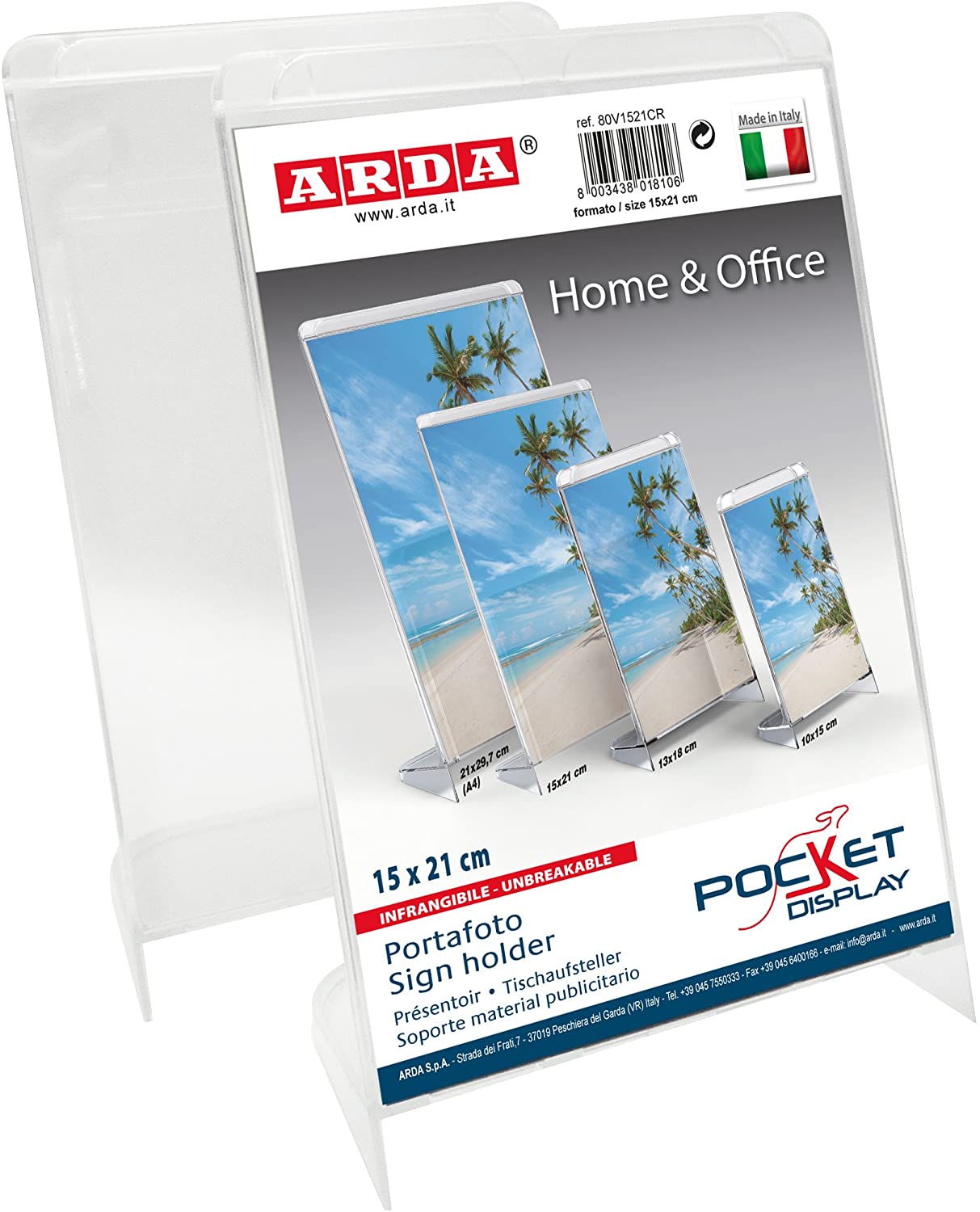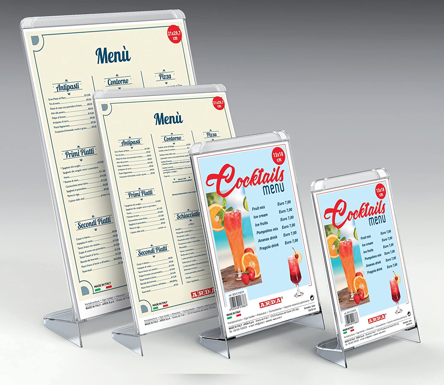 Acest suport de documente/foto de la Arda, Italia (Model 80V1521CR) este o soluție modernă și funcțională, perfectă pentru a afișa fotografii, liste de prețuri, meniuri sau orice material informativ în format $15 times 21$ cm.