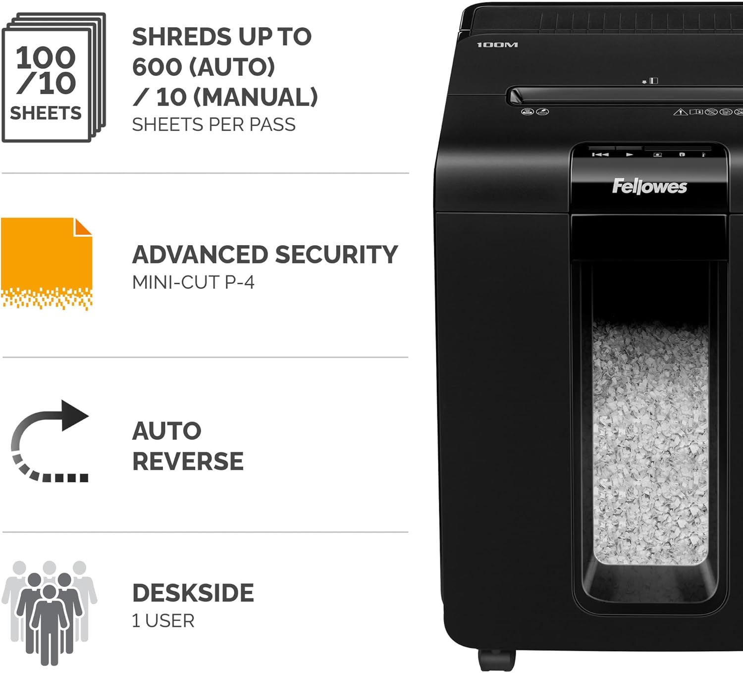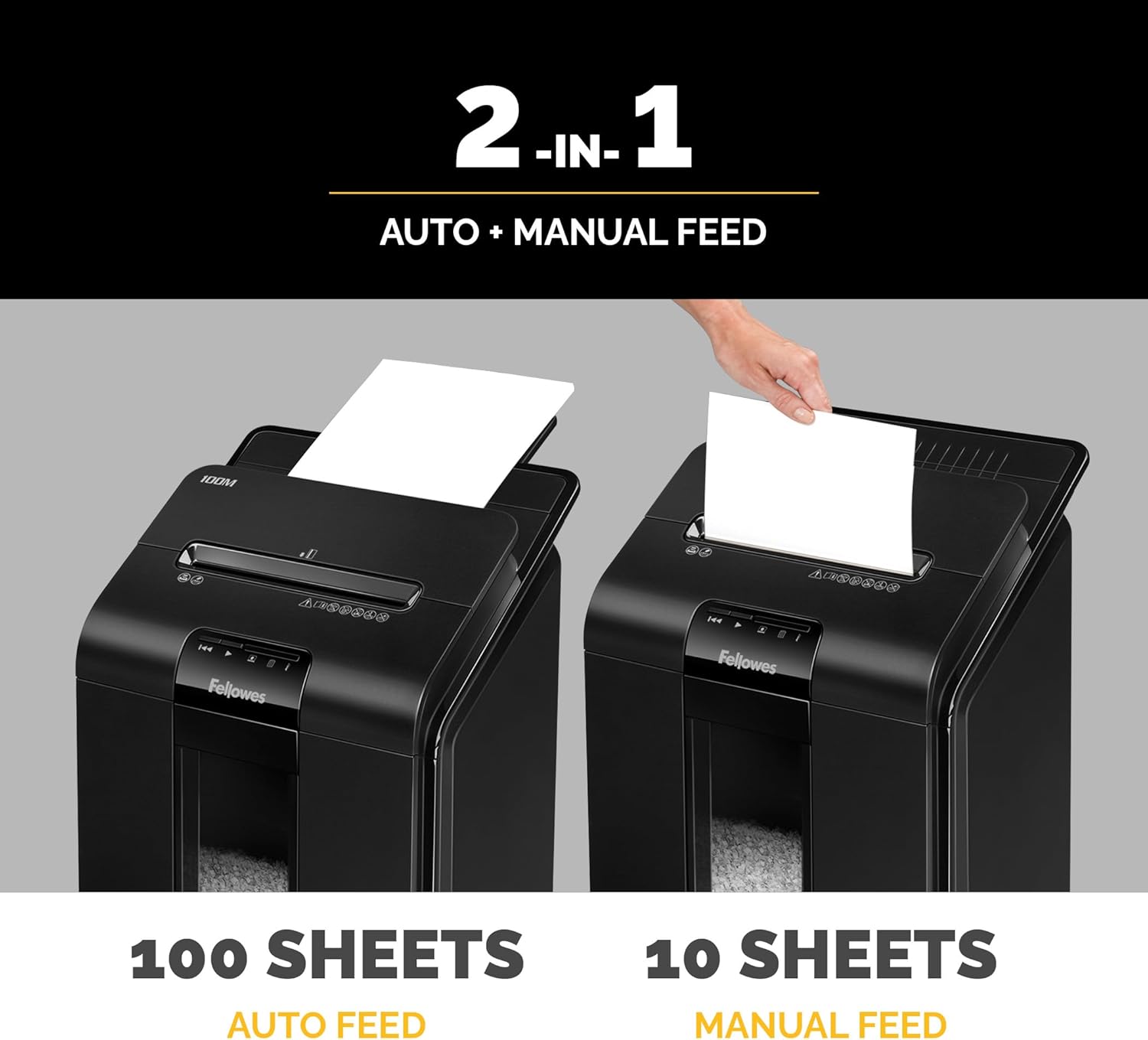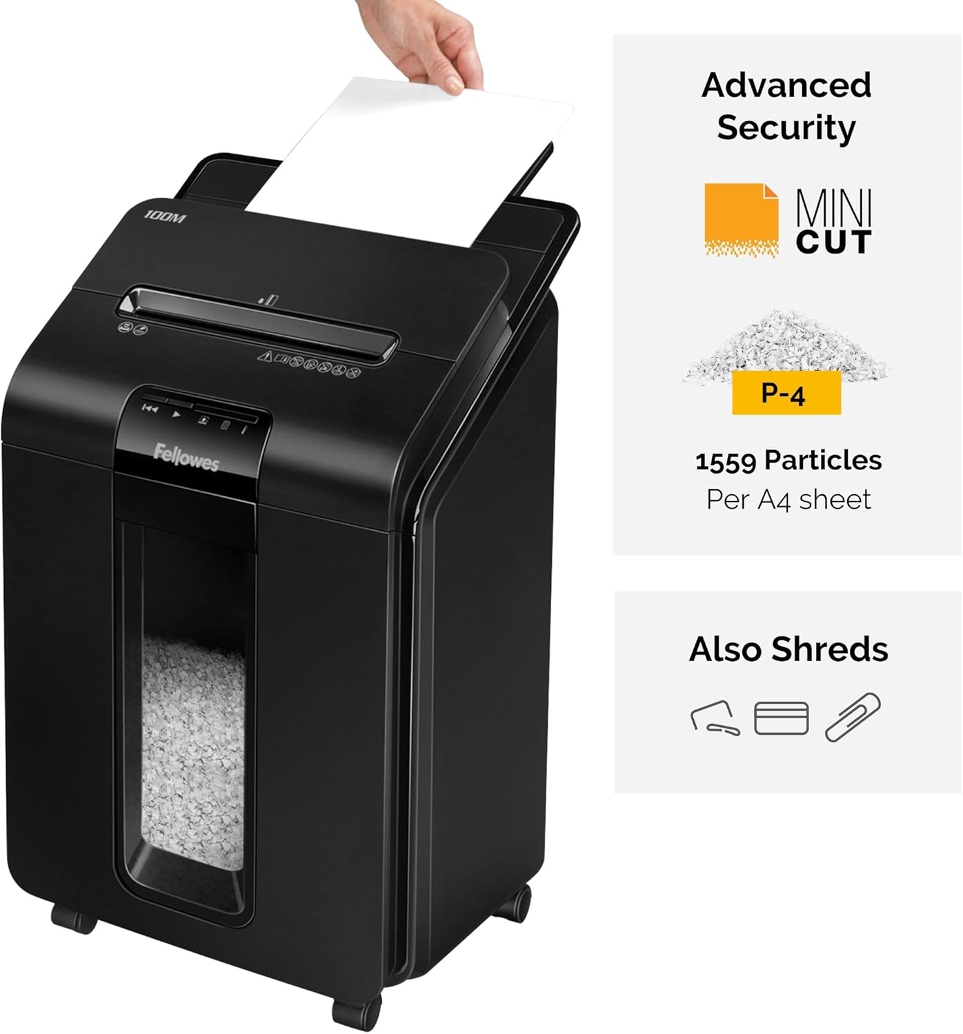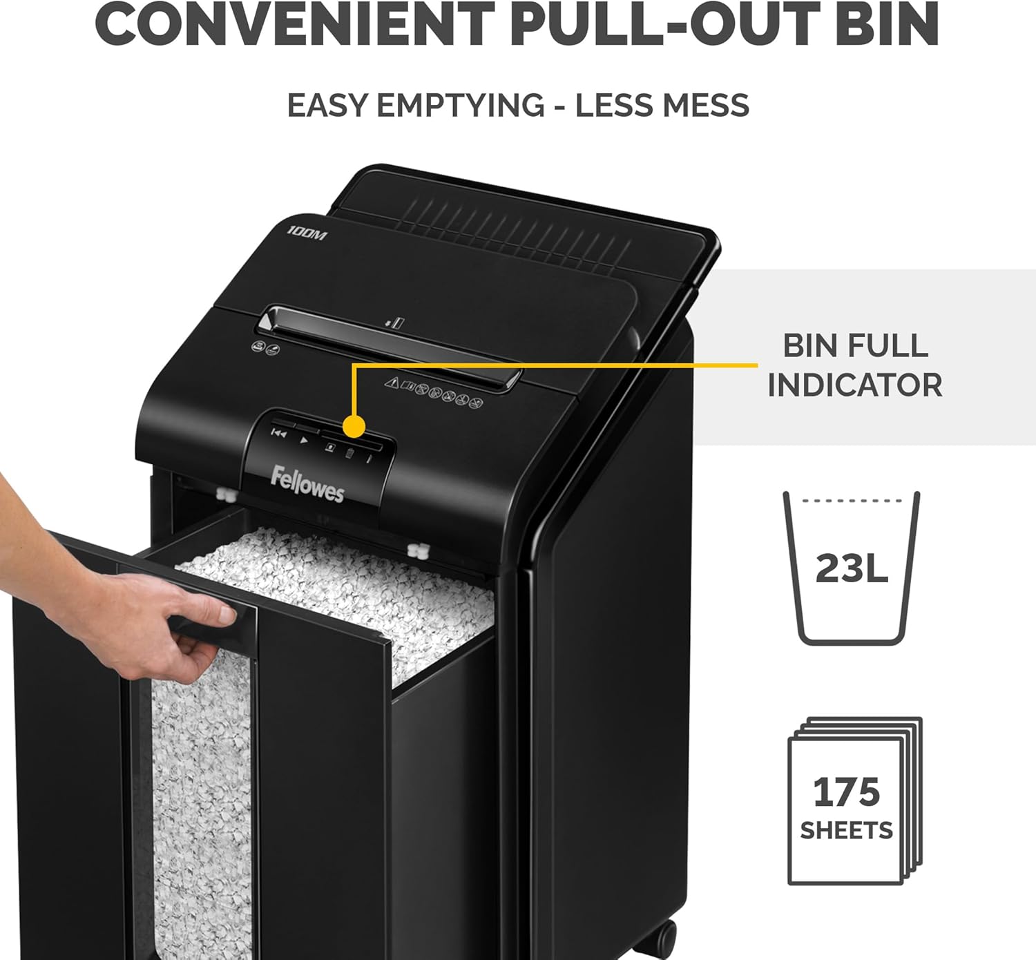 Alegeți FELLOWES AUTOMAX 100M pentru o distrugere sigură, eficientă și confortabilă a documentelor!