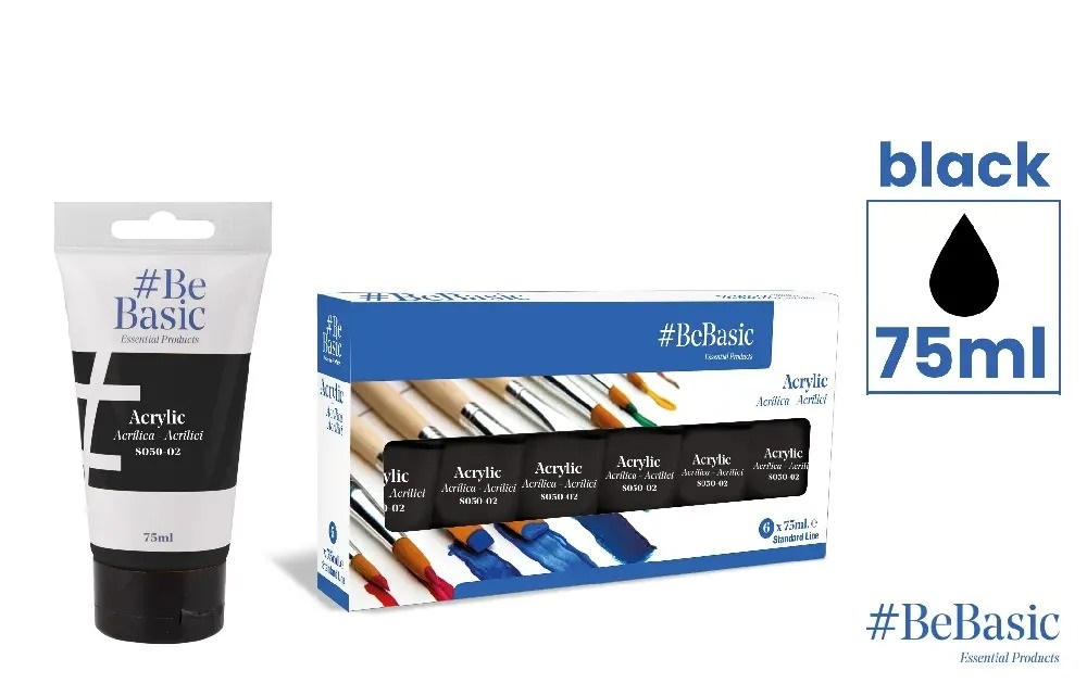Culori acrilice BeBasic Satin 75ML, negru S050-02 – o culoare esențială și versatilă pentru orice proiect artistic, oferind un finisaj satinat elegant și intensitate maximă în fiecare aplicare!