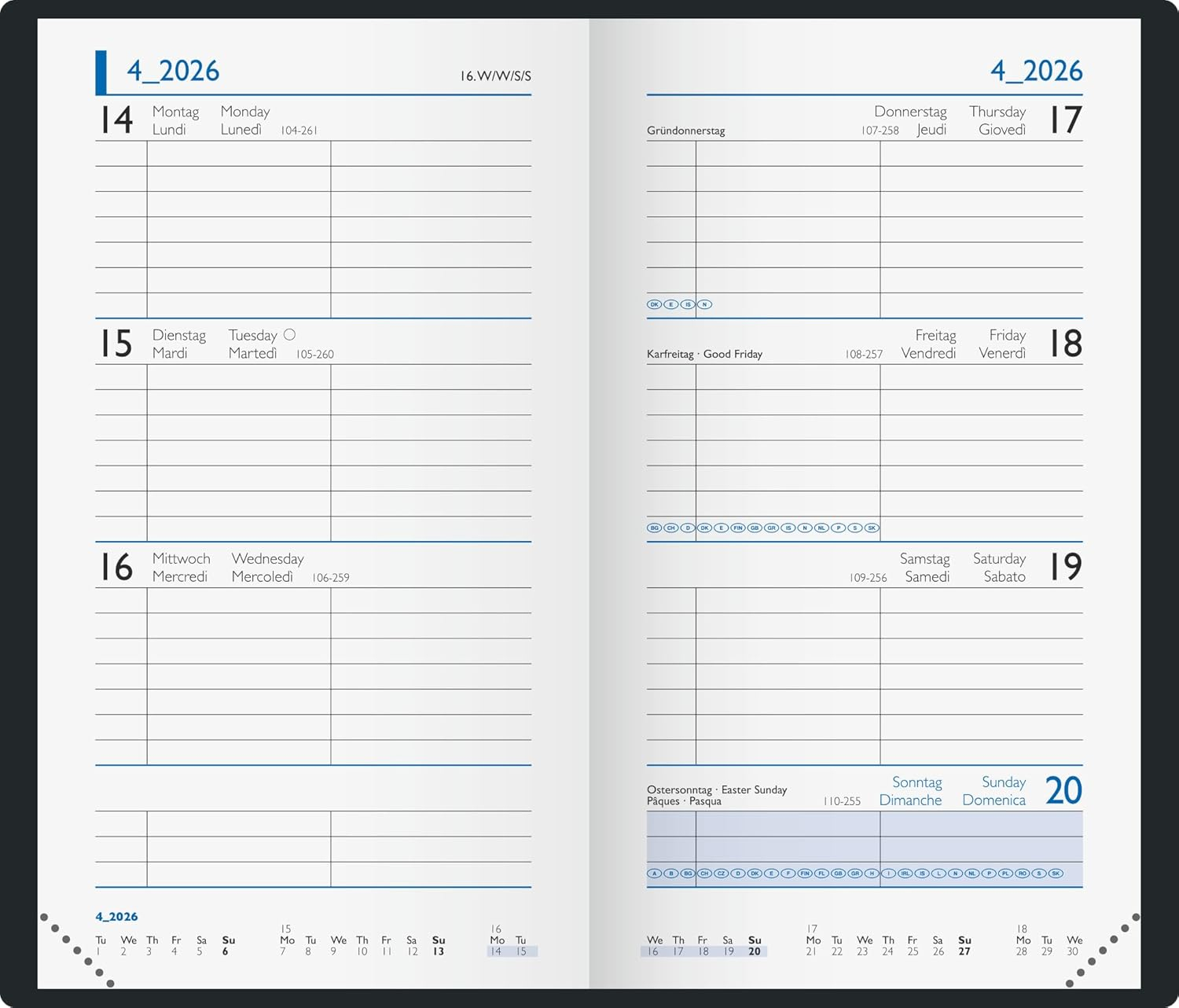 Limbaj: Agenda este cvadrilingvă: Germană, Engleză, Franceză, Italiană.