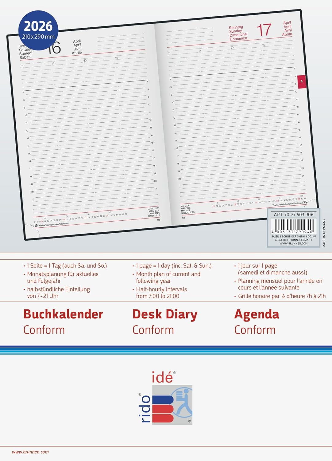 Agenda Rido/Idé Conform (Model 275) este instrumentul de management de birou, conceput pentru profesioniștii care au nevoie de spațiu amplu și o organizare complexă. Formatul A4 (210 x 297 mm) oferă spațiu maxim, iar structura interioară unică permite planificarea pe 4 zone distincte (coloane) sau o diviziune la sfert de oră – ideală pentru urmărirea echipei sau a proiectelor paralele.