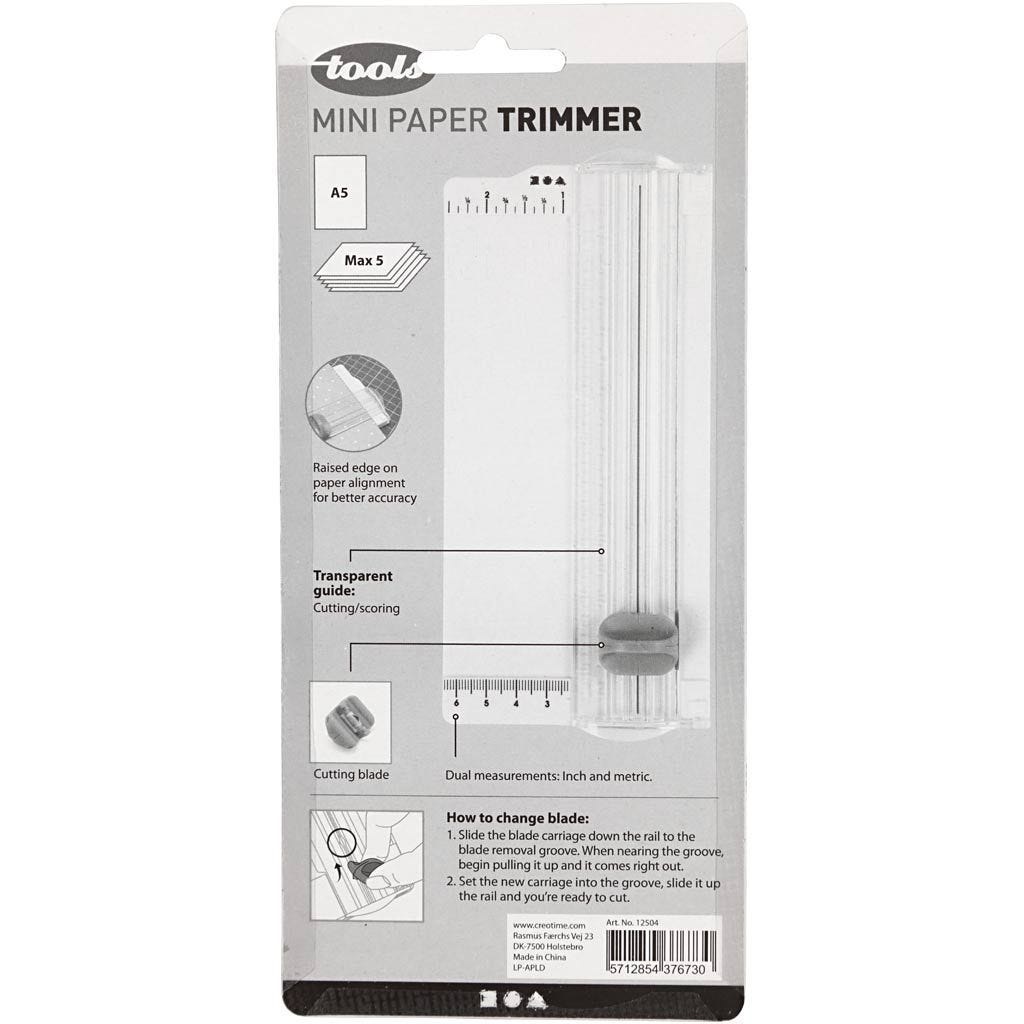 Portable cutting machine with plastic surface and printed guides. Can cut up to 5 sheets of paper at 80 g at a time. Extra knives - Item No. 12505