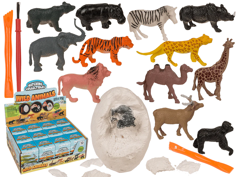 Specificatii: Tematica animale salbatice, Dimensiuni bloc ~7.4x5.2 cm, Set complet (bloc excavare + ciocan + pensula), 12 figurine diferite de colectat