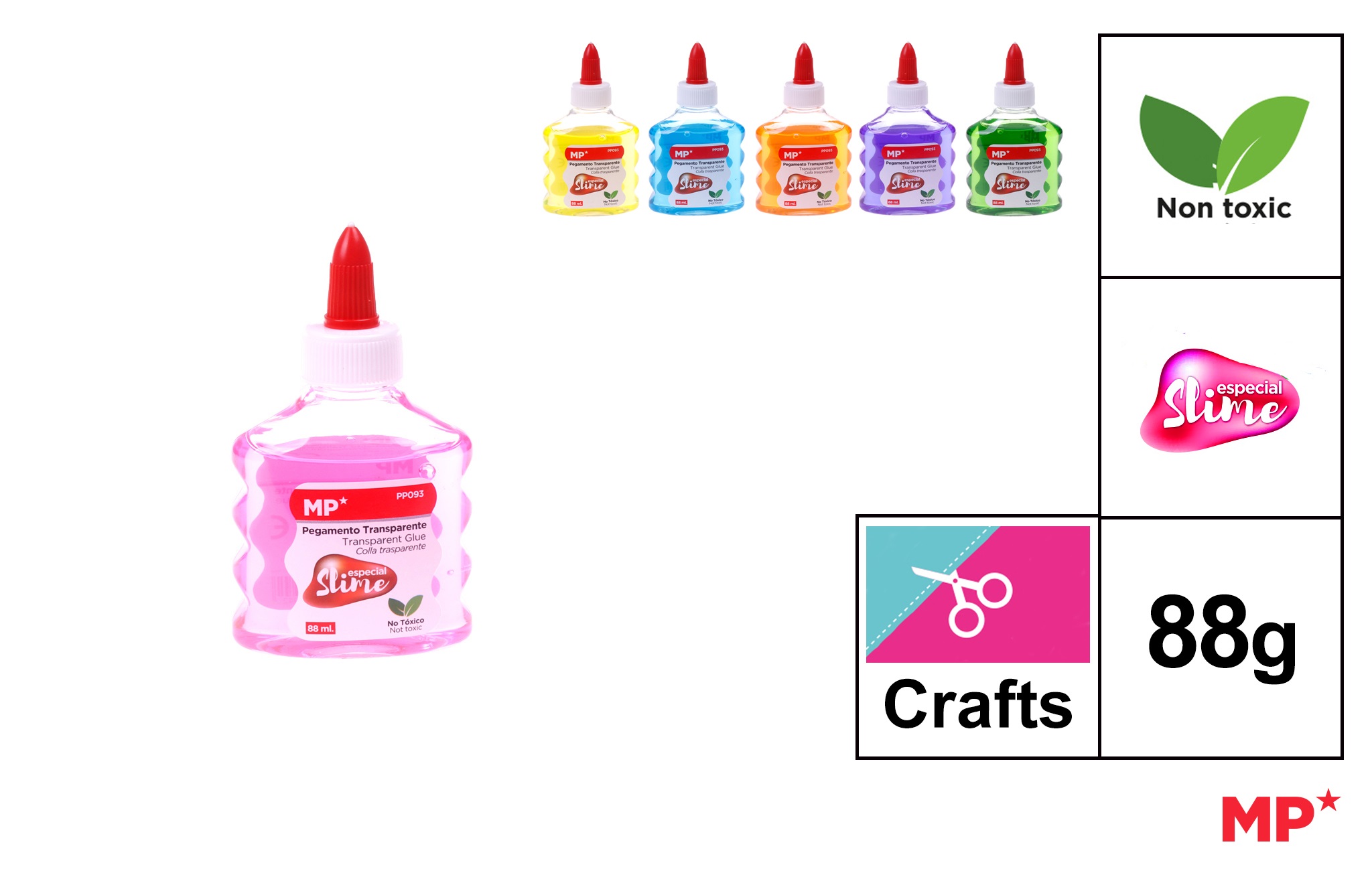 Adeziv colorat transparent, special pentru fabricarea varului cu culori foarte luminoase precum si pentru artizanat si decor. Ideal pentru uz scolar. Cu duza de dozare. Nu este toxic. 6 culori asortate: roz, violet, portocaliu, galben, verde și albastru. sticla de 88 ml.