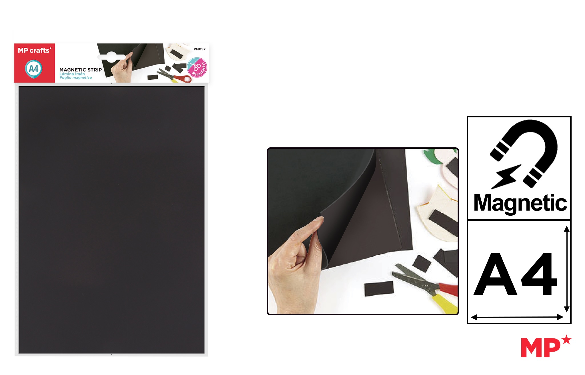 Magnetized sheet. It can be cut and adapted to thesizeof the crafts, they will become magnetic! A4 size.Measurements: 210 x 297 mm.