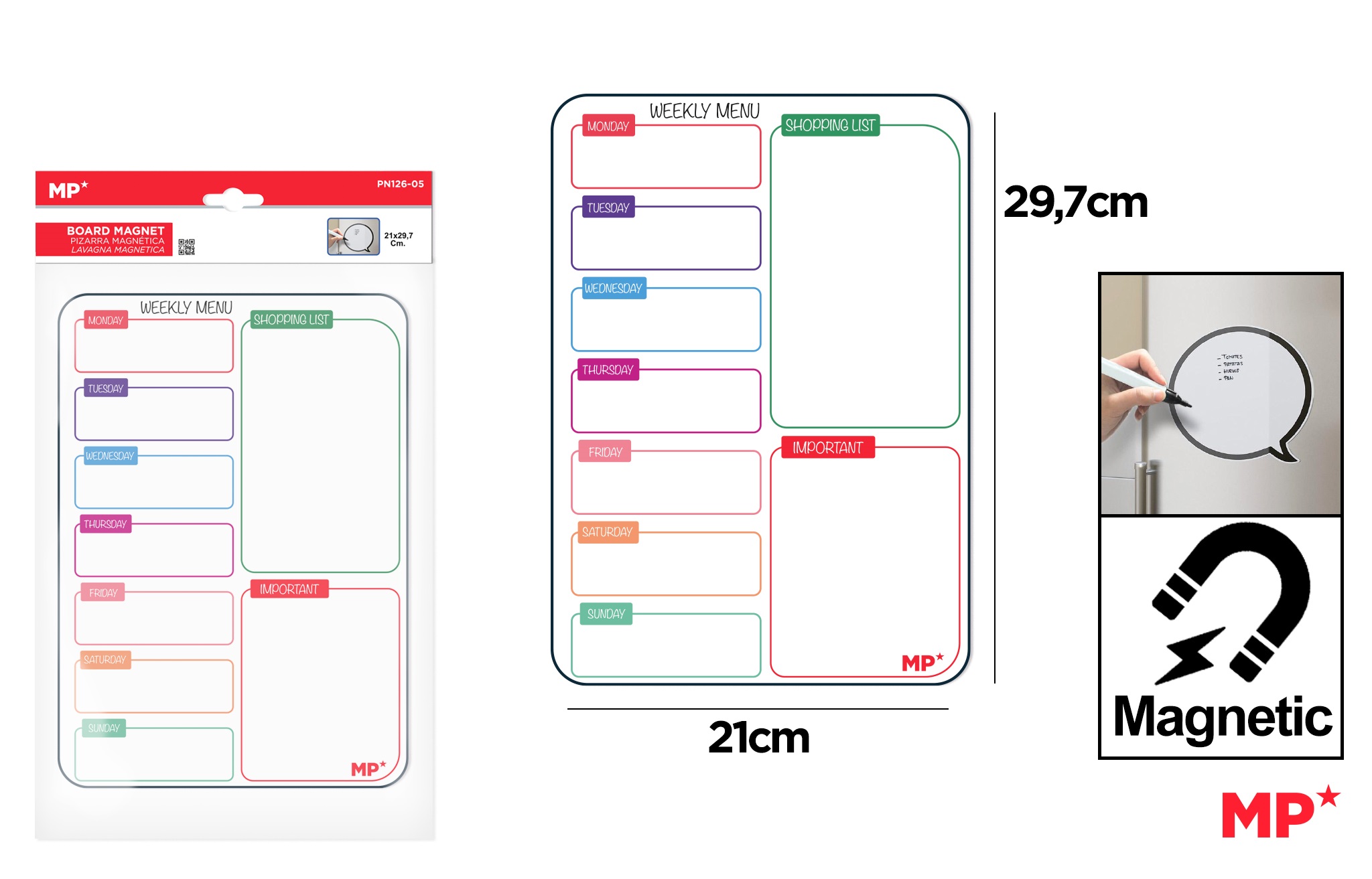 Orarul saptamanal magnetic este ideal pentru utilizare in scoli sau in birouri, pentru planificarea diverselor sarcini, pentru o saptamana. Datorita proprietatilor magnetice acesta se poate pozitiona cu usurinta pe orice suprafata metalica ex: ( frigider, tabla scolara) Suprafata magnetica. (ideal pentru frigider) Dimensiuni: 21x30 cm.