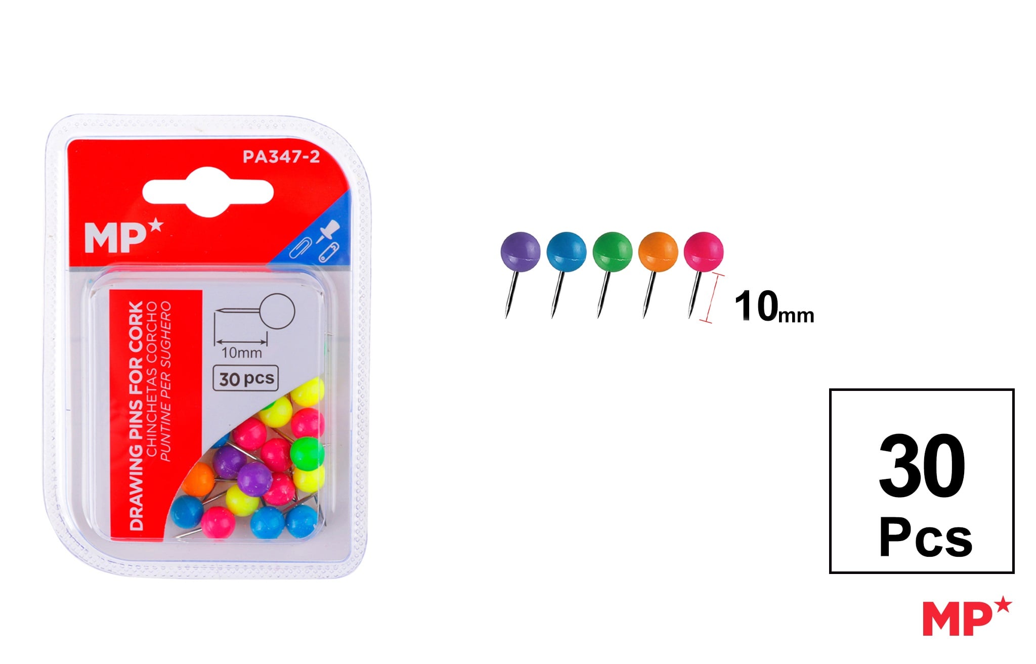 Pioneze metalice lungi de 10 mm cu cap de plastic. Culori Asortate. Cutie cu 30 de unitati.