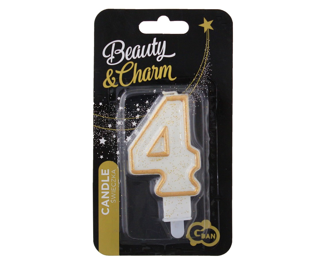 O lumanare frumoasa cu numarul 4 auriu este un decor perfect pentru orice tort de ziua de nastere. O lumanare in forma numarului 4 (patru) decorata cu sclipici aurii. Datorită unui picior special, lumânarea este ușor de așezat pe tort, datorită căruia numărul este complet vizibil, iar gaura din tort este foarte mică. In plus, piciorul asigura stabilitatea lumanarii. Decorul perfect de tort pentru un copil și un adult. De asemenea, va funcționa bine la tot felul de aniversari, evenimente corporative și oriunde puteți face un număr sau un an din numere.