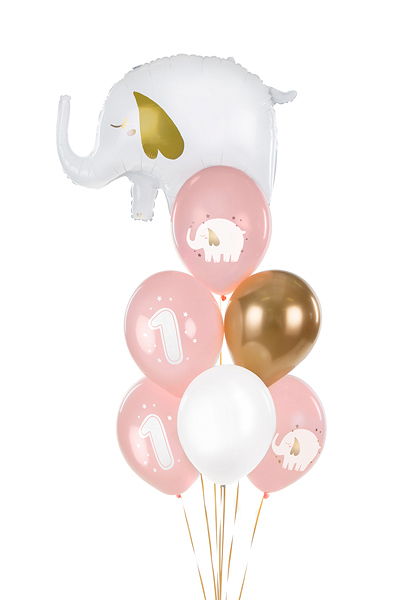 Strong balloons One year with print, set contains 6 balloons (2 in pastel Pale Pink colour with colorful print, 2 in pastel Pale Pink colour with white print, 1 in pastel Pure White colour and 1 in Glossy gold colour), diameter approx. 30 cm. (1 pkt / 6 pc.)