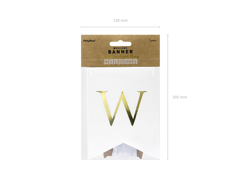 Banner, white with gold inscription Welcome, do it yourself, set contains letters and approx. 2.5 m of white ribbon, sizes after assembling: height approx. 15 cm, length approx. 95 cm. 1 pkt / 1 pc. symbol: GRL70-008